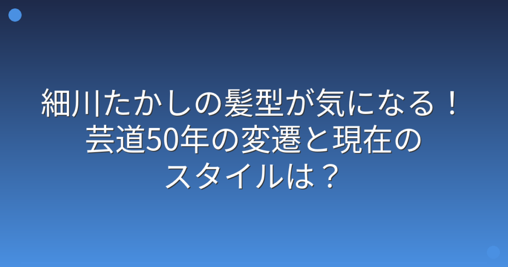 演歌界のレジェンド・細川たかしさんが、芸道50年を迎えて話題になっていますね。 長年テレビで活躍される中で、細川たかしさんの髪型がどのように変化してきたのか気になる方も多いのではないでしょうか。 そこで今回は、細川たかしさんの髪型について、... -