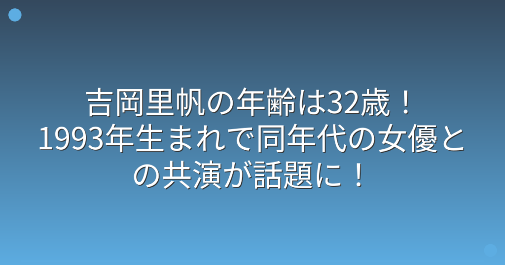 女優の吉岡里帆さんが、NHKドラマ『ひらやすみ』での演技やクリスマスイベントへの出演で注目を集めていますね。 吉岡里帆さんの年齢や生年月日について気になっている方も多いのではないでしょうか。 そこで今回は、吉岡里帆さんの年齢や生年月日、プロフ... -