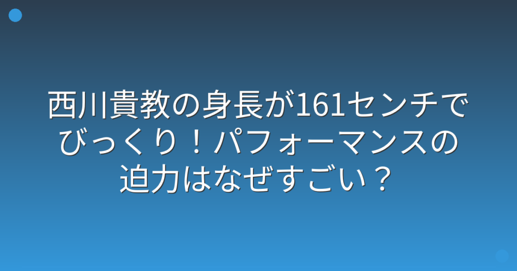 人気アーティスト西川貴教さんの身長について、多くのファンの間で話題になっていますね。 特に、ライブでの迫力あるパフォーマンスと実際の身長とのギャップに驚く声が多く聞かれています。 そこで今回は、西川貴教さんの身長や体型について、詳しく見て...